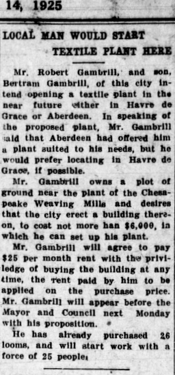 By the late summer of 1897 the textile works of M. Gambrill & Company had been partially relocated from Cecil County to Havre de Grace with 40 looms turning out cotton table cloths. The Harford Democrat of August 13, 1897 noted, “When the plant is in full operation 210 looms will be used in the manufacture of cotton goods. A 250 horse power engine has been put in, which will take the place of the one now in use, which is inadequate. It is stated that when the plant is in full operation about 300 hands will be given steady employment.” As a result of the textile plant coming to the city all of the available tenant houses had been occupied and about 40 new families had moved into Havre de Grace.